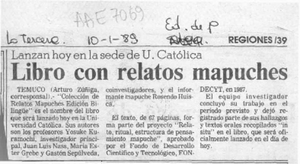 Libro con relatos mapuches [artículo] Arturo Zúñiga.