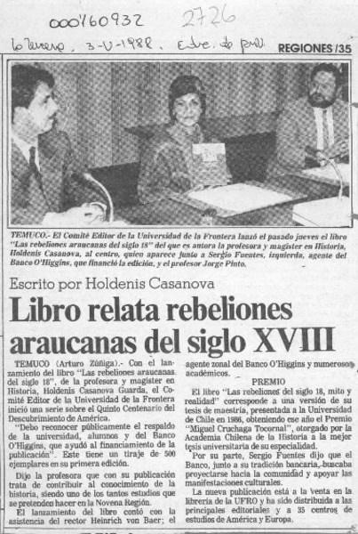 Libro relata rebeliones araucanas del siglo XVIII [artículo] Arturo Zúñiga.