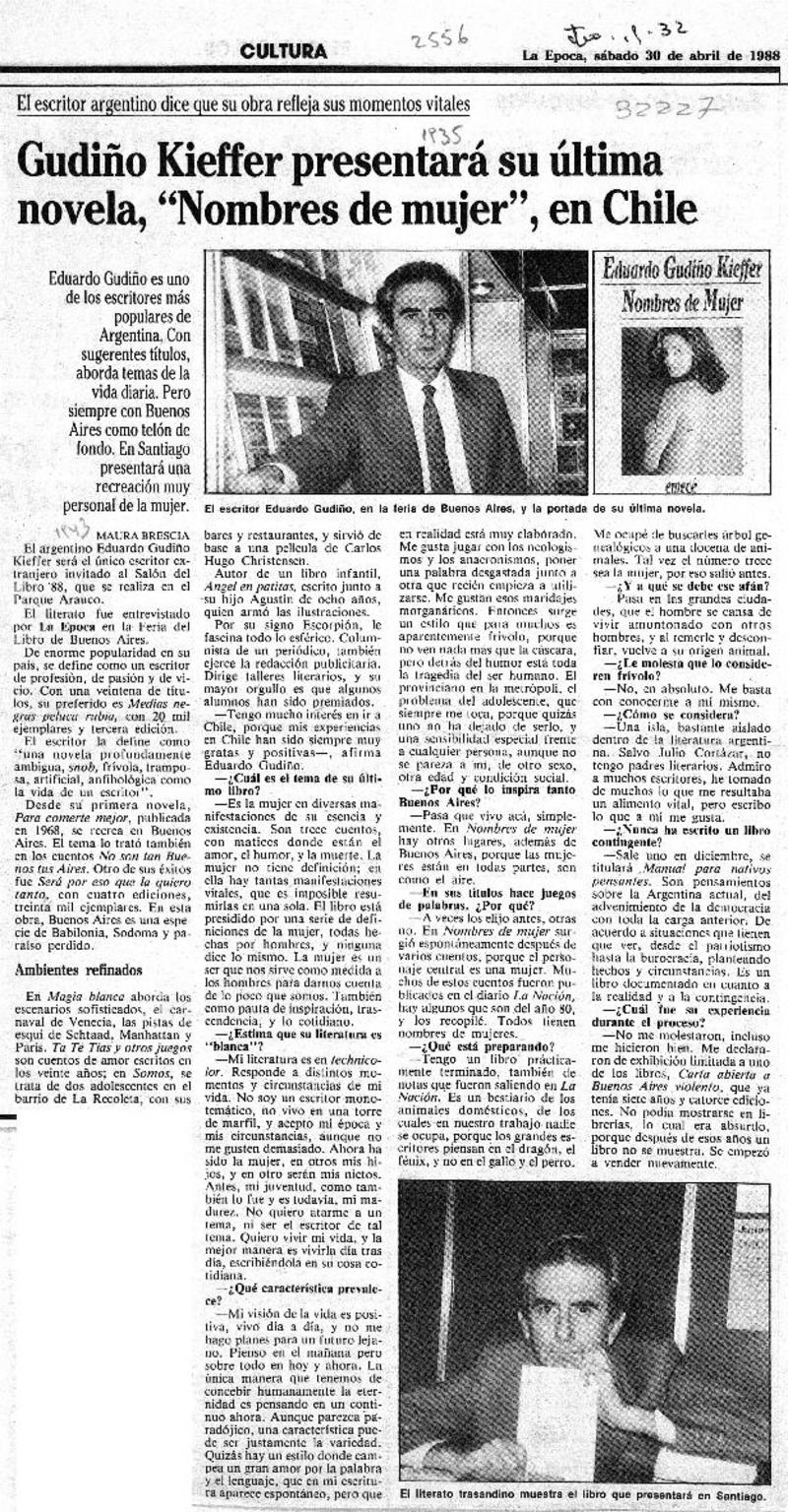 Gudiño Kieffer presentará su última novela, "Nombres de mujer", en Chile [entrevista] : [artículo] Maura Brescia.