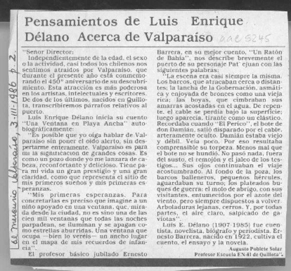 Pensamientos de Luis Enrique Délano acerca de Valparaíso [artículo] Augusto Poblete Solar.
