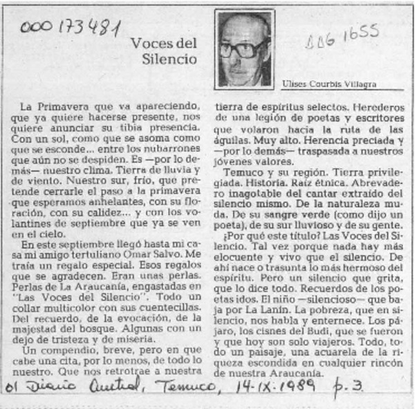 Un poeta ofrece su madrigal [artículo] Ulises Courbis Villagra.