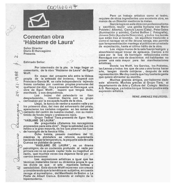 Comentan obra "Háblame de Laura" [artículo] René Jiménez Rieutord.