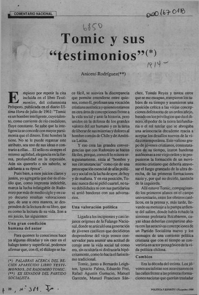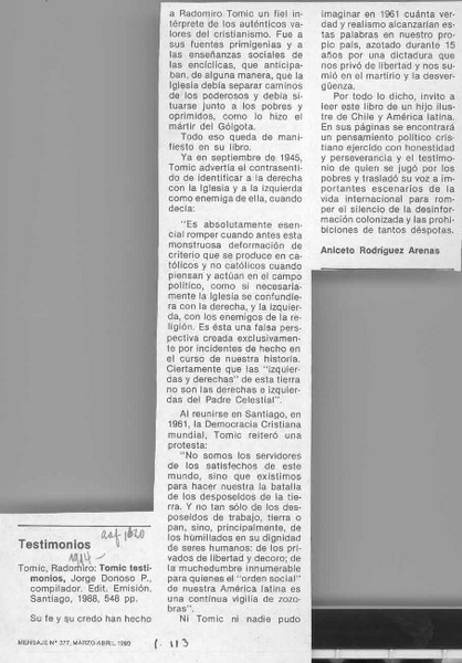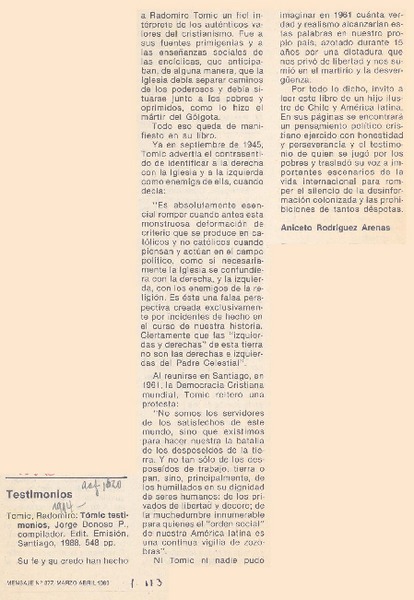 TOMIC, RADOMIRO - TOMIC TESTIMONIOS