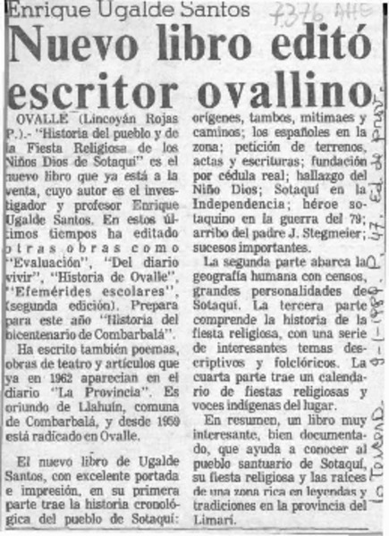 Nuevo libro editó escritor ovallino [artículo] Lincoyán Rojas P.