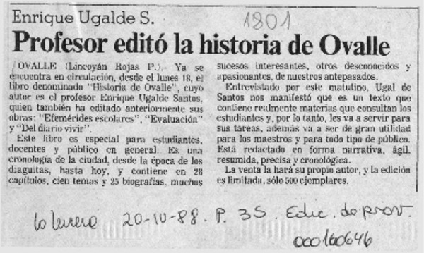 Profesor editó la historia de Ovalle [artículo] Lincoyán Rojas P.