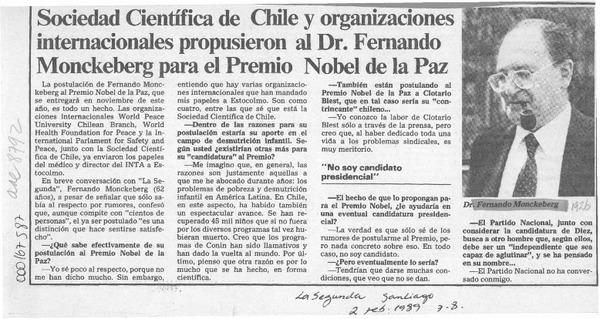 Sociedad Científica de Chile y organizaciones internacionales propusieron al Dr. Fernando Monckeberg para el Premio Nobel de la Paz [artículo].