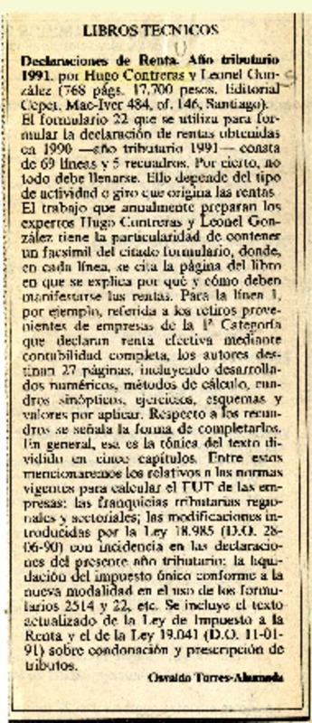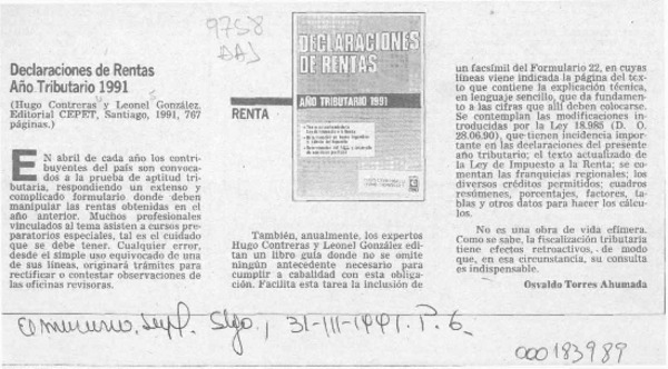 Declaraciones de renta, año tributario 1991 [artículo] Osvaldo Torres-Ahumada.