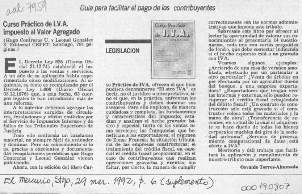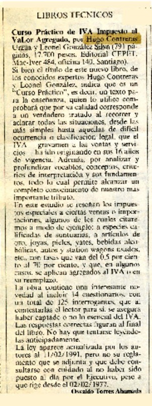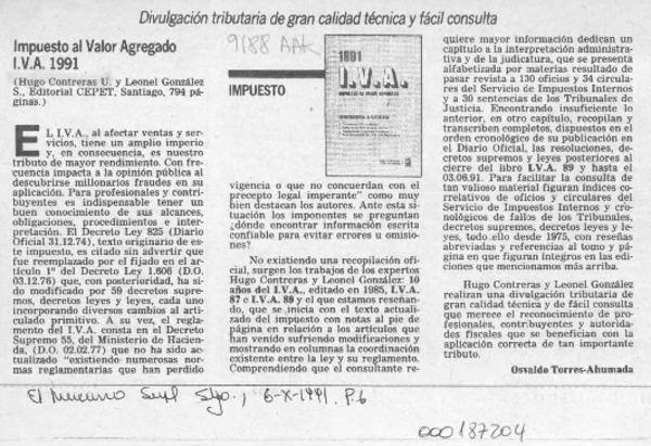 Impuesto al valor agregado, I. V. A. 1991 [artículo] Osvaldo Torres-Ahumada.
