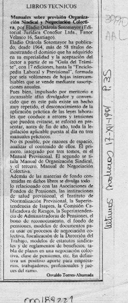 Manuales sobre previsión, organización sindical y negociación colectiva [artículo] Osvaldo Torres-Ahumada.