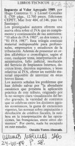 Impuesto al valor agregado 1989 [artículo] Osvaldo Torres-Ahumada.