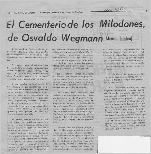 El cementerio de los milodones, de Osvaldo Wegmann [artículo] Jean Lebleu.