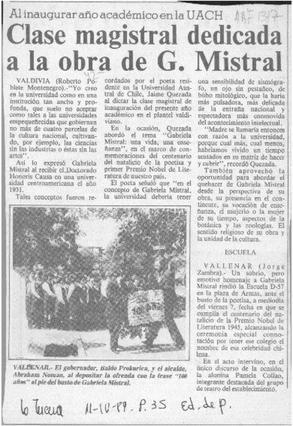 Clase magistral dedicada a la obra de G. Mistral [artículo] Roberto Poblete Montenegro.