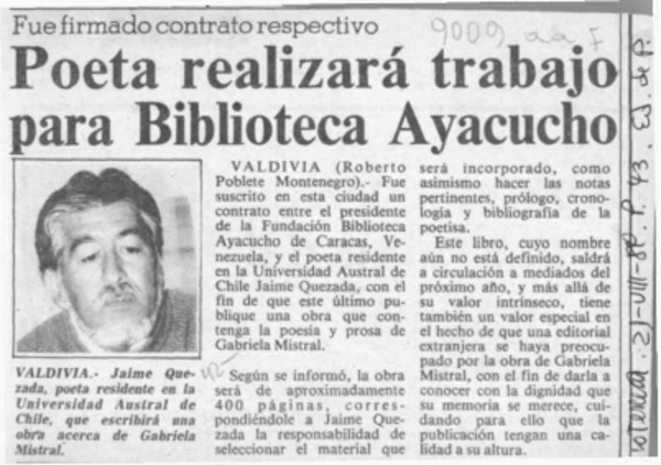 Poeta realizará trabajo para biblioteca Ayacucho [artículo] Roberto Poblete Montenegro.