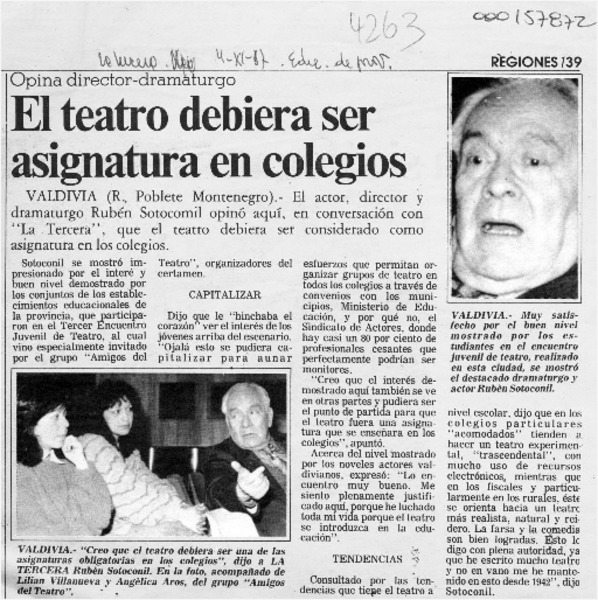 El teatro debiera ser asignatura en colegios [artículo] R. Poblete Montenegro.