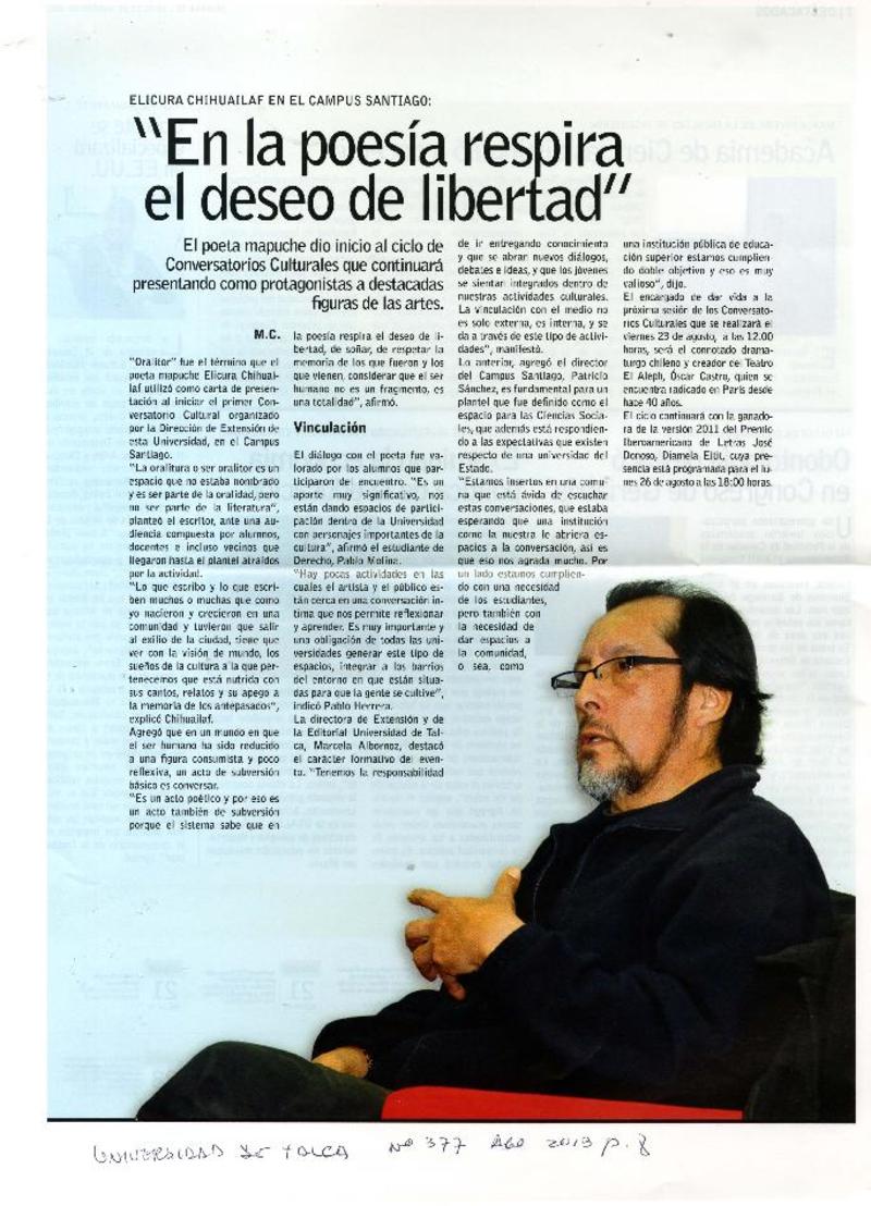 Elicura Chihuailaf en el Campus Santiago: "En la poesía respira el deseo de libertad" [artículo] M.C.