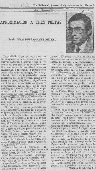 Aproximación a tres poetas [artículo] Juan Bustamante Michel.