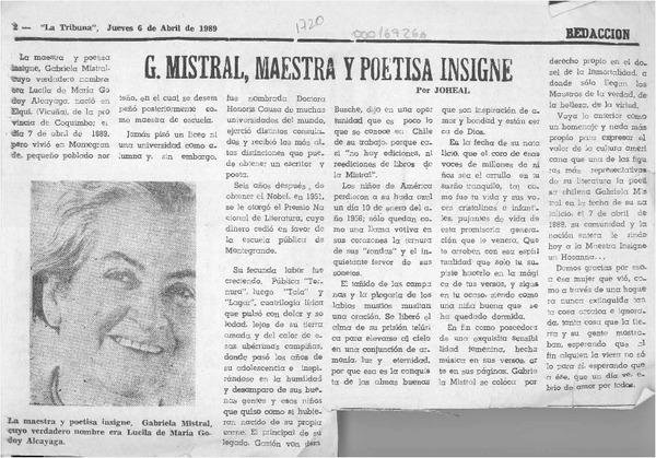 G. Mistral, maestra y poetisa insigne [artículo] Joheal.