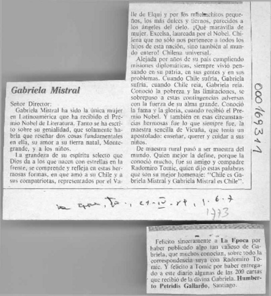 Gabriela Mistral [artículo] Humberto Petridis Gallardo.