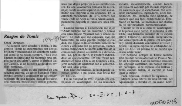 TOMIC ERRAZURIZ, ESTEBAN - 1988 -- Y EL GENERAL BAJO AL LLANO