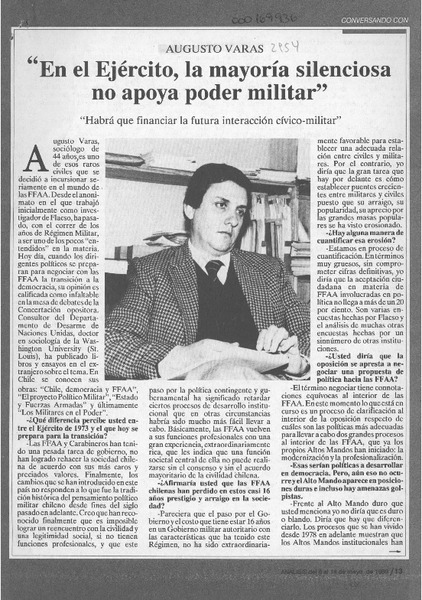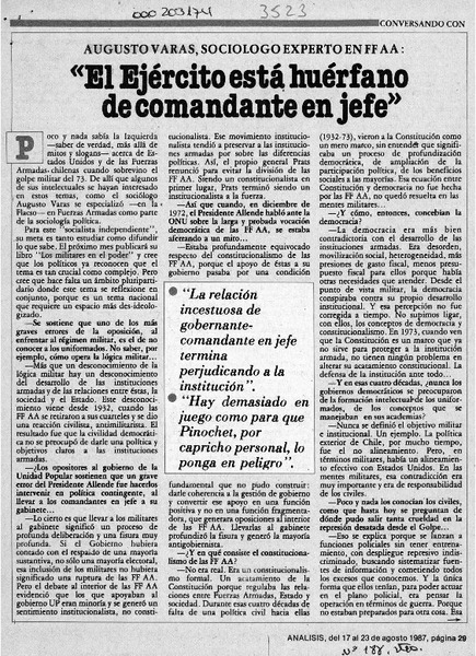 Augusto Varas "Hay que evitar que las Fuerzas Armadas sean manoseadas" [artículo] María Irene Soto.