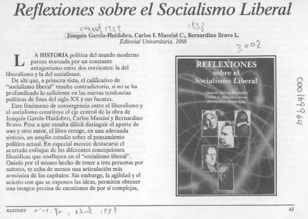 Autores chilenos - MASSINI CORREA, CARLOS I. - REFLEXIONES SOBRE EL SOCIALISMO LIBERAL - GARCIA-HUIDOBRO CORREA, JOAQUIN - BRAVO LIRA, BERNARDINO - Autores argentinos