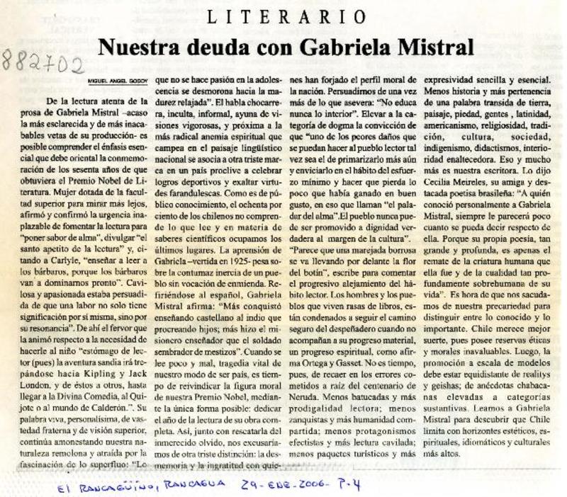 Nuestra deuda con Gabriela Mistral [artículo] Miguel Angel Godoy.