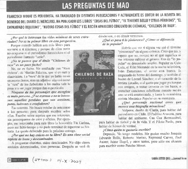 Autores chilenos - Mouat, Francisco - Entrevistas - Chilenos de raza