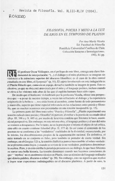VICUÑA, ANA MARIA - FILOSOFIA, POESIA Y MITO A LA LUZ DE EROS EN EL SYMPOSIO DE PLATON
