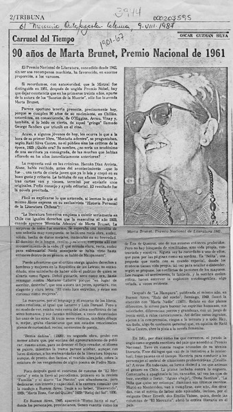 90 años de Marta Brunet, Premio Nacional de 1961 [artículo] Oscar Guzmán Silva.