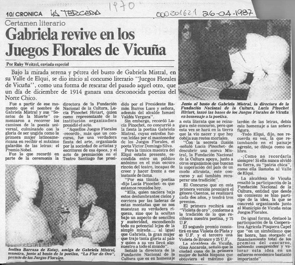 Gabriela revive en los juegos florales de Vicuña [artículo] Ruby Weitzel.
