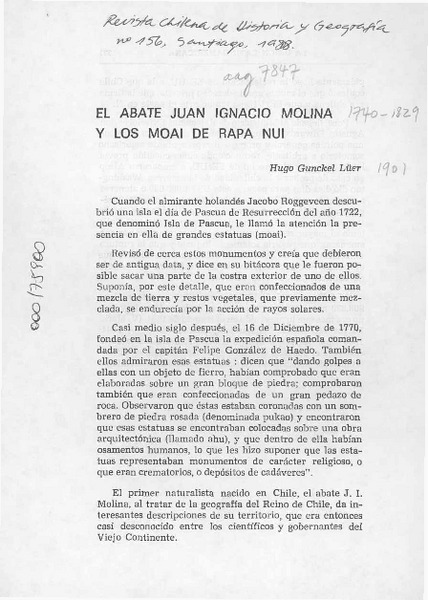 El abate Juan Ignacio Molina y los moai de Rapa Nui [artículo] Hugo Gunckel Lüer.