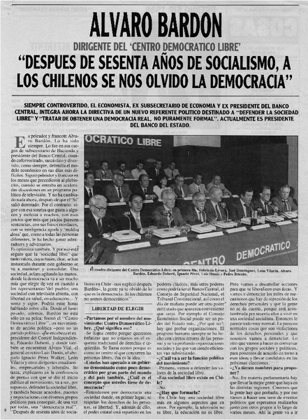 Después de setenta años de socialísmo, a los chilenos se nos olvido la democracia" : [Entrevista] [artículo] Manuel Santelices.