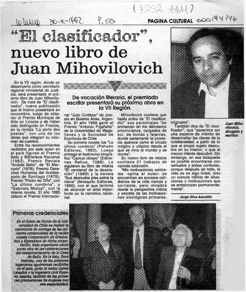 "El clasificador", nuevo libro de Juan Mihovilovich [artículo] Jorge Silva Astudillo.