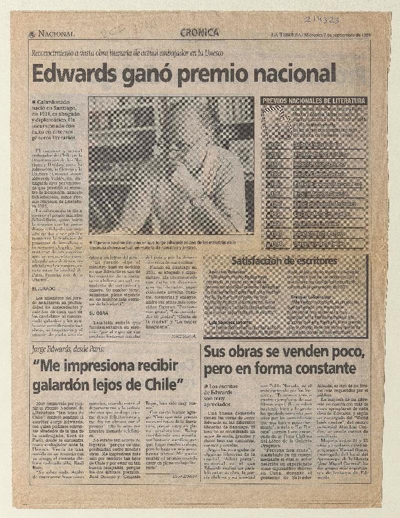 Edwards ganó Premio Nacional [artículo] Jorge Silva A.