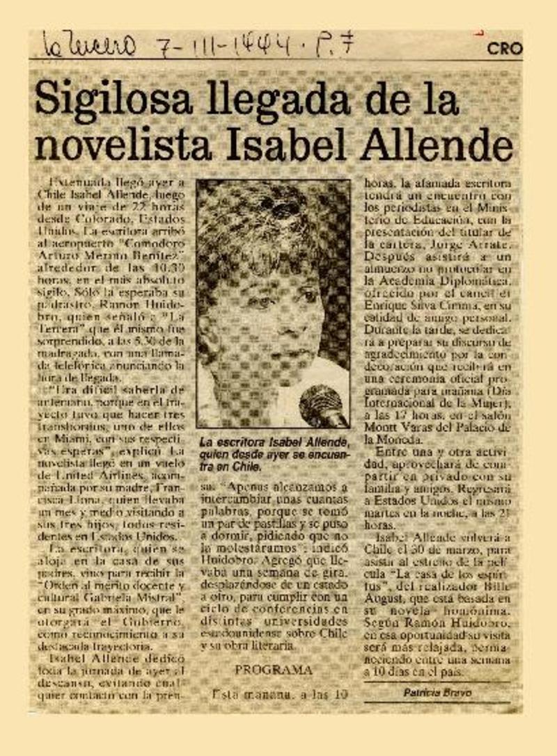 Sigilosa llegada de la novelista Isabel Allende [artículo] Patricia Bravo.
