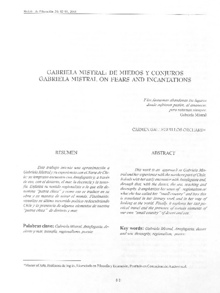 Gabriela Mistral: de miedos y conjuros Gabriela Mistral on fears and incantations. [artículo] Carmen Galleguillos Orchard
