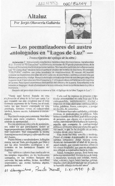Los poematizadores del austro antologados en "Lagos de luz" [artículo] Jerjes Olavarría Gallardo.