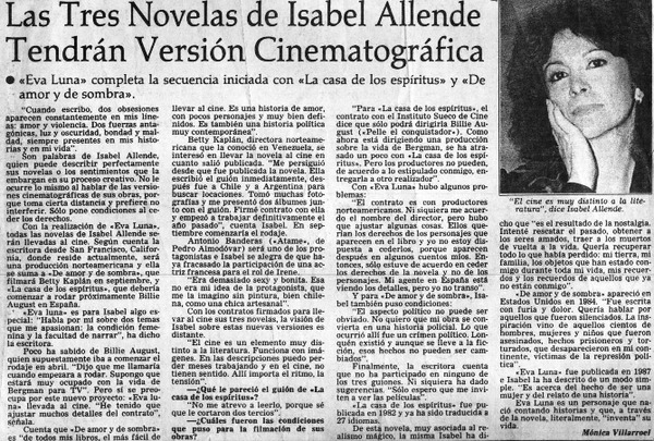 Las tres novelas de Isabel Allende tendrán versión cinematográfica [artículo] Mónica Villarroel.