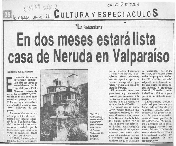 En dos meses estará lista casa de Neruda en Valparaíso [artículo] Guillermo Jofré.