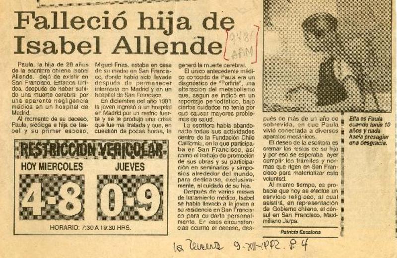 Falleció hija de Isabel Allende [artículo] Patricia Escalona