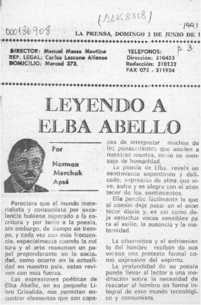 Leyendo a Elba Abello [artículo] Norman Merchak Apsé.