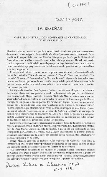 Gabriela Mistral, dos homenajes al centenario de su natalicio [artículo] Antonio Lobos González.