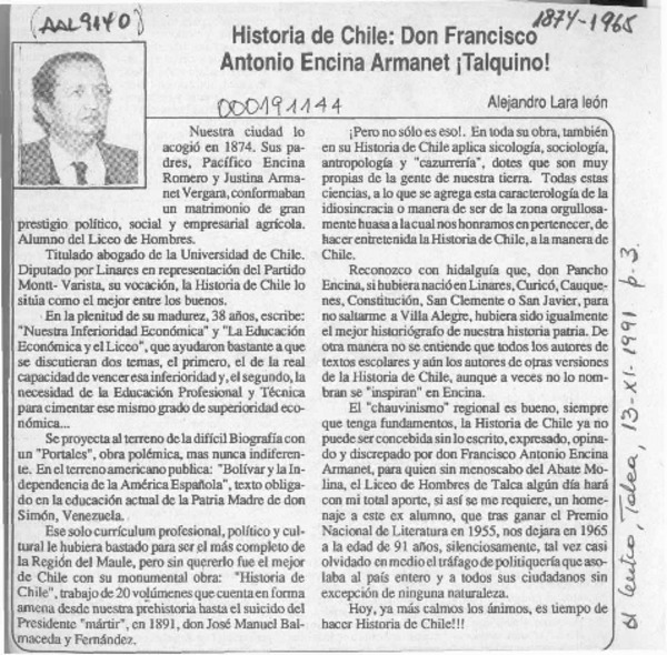Historia de Chile, Don Francisco Antonio Encina Armanet, talquino! [artículo] Alejandro Lara León.