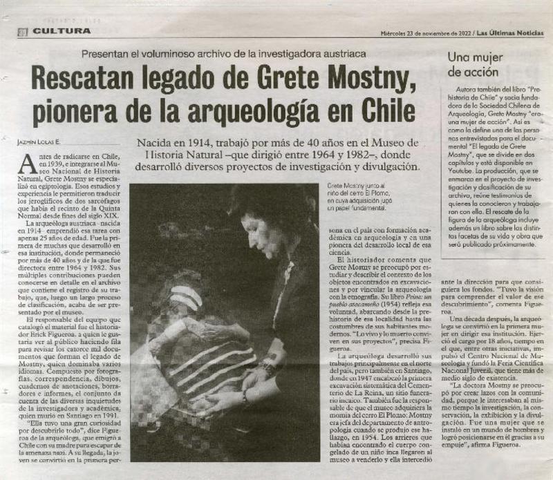 Rescatan legado de Grete Mostny, pionera de la arqueología en Chile [artículo] Jazmín Lolas E.