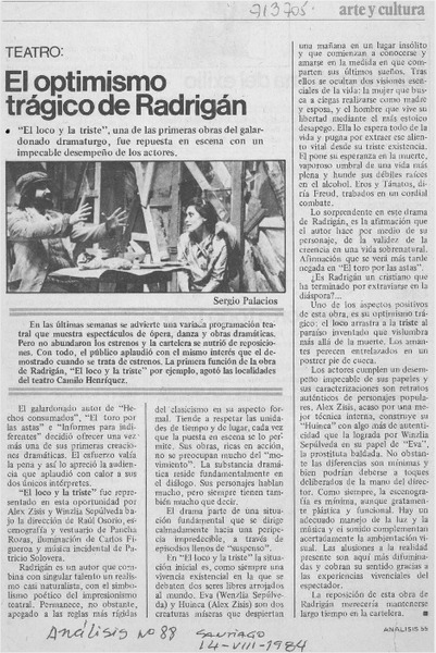 El optimismo trágico de Radrigán [artículo] Sergio Palacios.