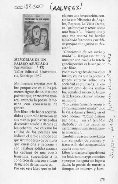 Autoras chilenas - Molina, Paz - Memorias de un pájaro asustado