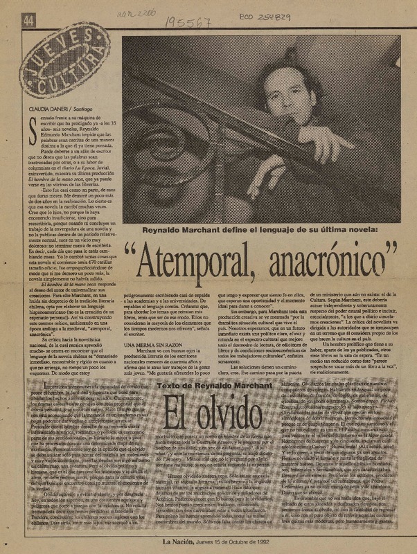 Reinaldo Marchant define el lenguaje de su última novela, "Atemporal, anacrónico" [artículo] Claudia Daneri.