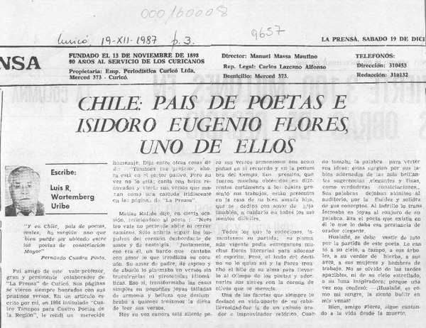 Chile, país de poetas e Isidoro Eugenio Flores, uno de ellos [artículo] Luis R. Wartemberg Uribe.