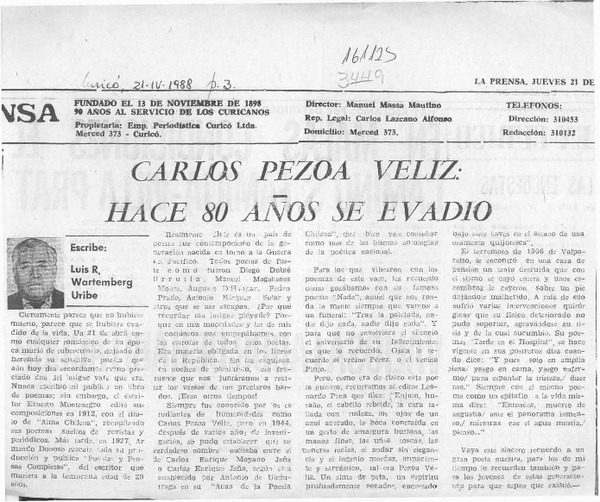 Carlos Pezoa Véliz, hace 80 años se evadió [artículo] Luis R. Wartemberg Uribe.