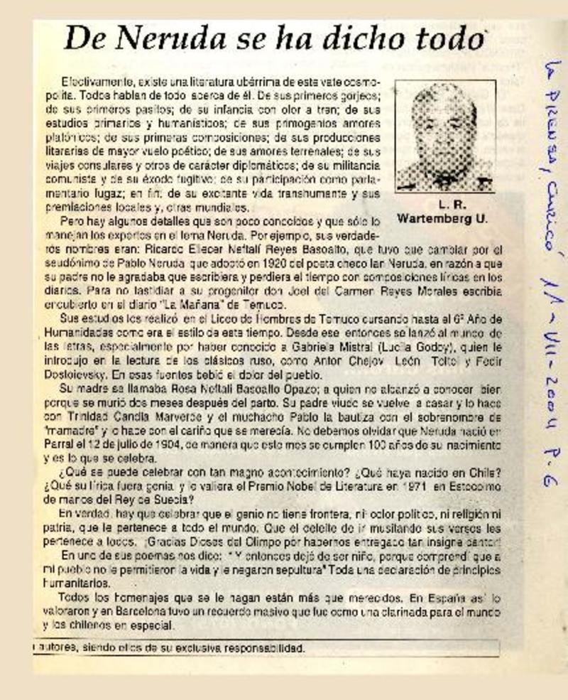 De Neruda se ha dicho todo [artículo] Luis R. Wartemberg Uribe.